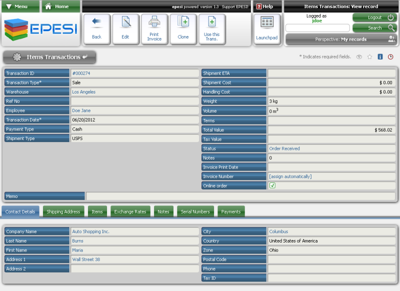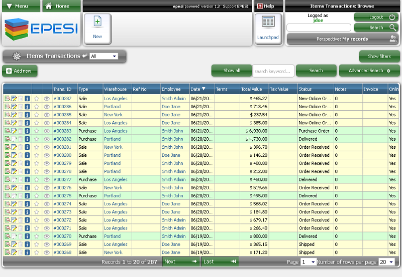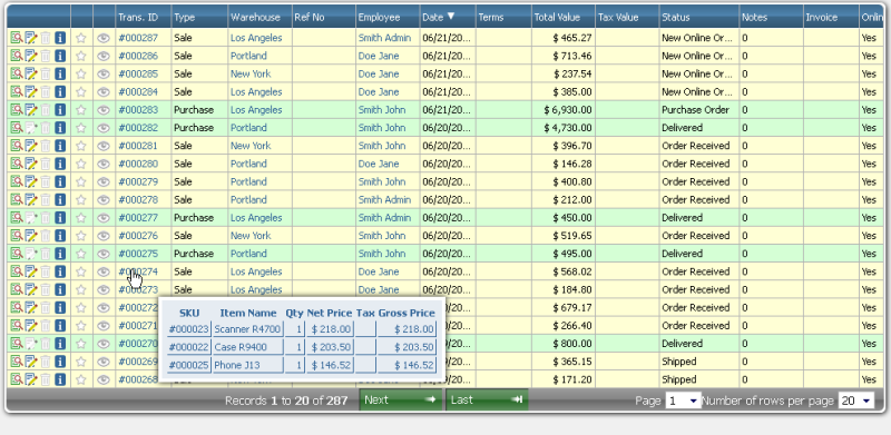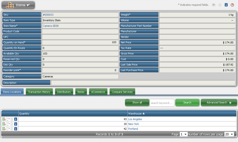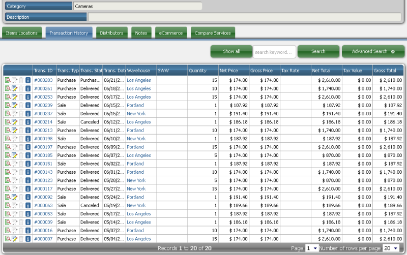 - Transactions - types: purchase, sales quote, sale, inventory adjustment, warehouse transfer, check-in, check-out